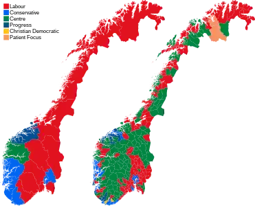 It saw a big win for the left-wing opposition in an election fought on climate change, inequality, and oil.[5] Late at night on 13 September, incumbent Conservative Party prime minister Erna Solberg conceded defeat.[6] Her party ended up with the second-largest number of representatives. Jonas Gahr Støre's Labour Party retained its position as Norway's largest party and expanded their lead in seats over the Conservatives, despite a slight drop in its share of votes and the loss of one seat.[2]