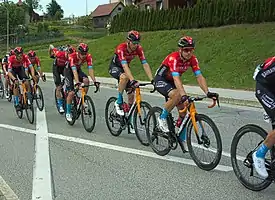 ![]() Team Bahrain Victorious leading the peloton on Stage 1 of the Tour of Slovenia | |
