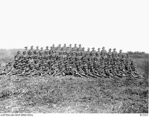 The 20th Battalion was raised in March 1915 in Liverpool, New South Wales, as part of the Australian Imperial Force (AIF). A small number of its original recruits had already served with the Australian Naval and Military Expeditionary Force in New Guinea in 1914.[3] After undertaking initial training, the battalion left Australia in June and after a further period of training in Egypt they landed at Anzac Cove on 22 August 1915 as part of the 5th Brigade, 2nd Division. They played only a minor part in the fighting during the August Offensive which was coming to a close by the time they arrived and so for the majority of time that they were at Gallipoli, the battalion was deployed in the defence of Russell's Top.[3] They remained on the peninsula until the evacuation on 20 December 1915.[3]