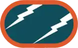 The 313th's flash is a teal blue shield-shaped embroidered item with a semi-circular base. Around the edge of the flash is a 1⁄8 inch (0.32 cm) orange border, two white lightning bolts bendwise sinister, one issuing from the top of the flash and one issuing from the lower right side; the overall dimensions are 2+1⁄4 inches (5.7 cm) in height by 1+7⁄8 inches (4.8 cm) in width. The airborne background trimming is a teal blue oval-shaped embroidered item edged with a 1⁄8 inch (0.32 cm) orange border two white lightning bolts bendwise sinister, one issuing from the top of the item and one issuing from the right side. The overall dimensions are 1+3⁄8 inches (3.5 cm) in height by 2+1⁄4 inches (5.7 cm) width. [31]