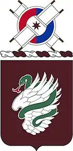Maroon and white are colors of the Army Medical Service. The design is adapted from the badge of the 326th Airborne Company, from which the Battalion is descended. The wing illustrates the parent organization's airborne function and the serpent represents its medical function.[13]