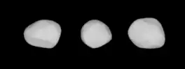 Australian amateur astronomer Jonathan Bradshaw recorded an unusual asteroid occultation by 32 Pomona on 16 August 2008. The expected maximum duration of the occultation was 7.1 secs; however, the video recording shows two separate occultations of equal depth each lasting 1.2 seconds, separated by 0.8 secs. Those durations convert to chord lengths at the asteroid of 15 km, 10 km, and 15 km – for a total length of 40 km.[8] The IRAS diameter for Pomona is 80.8 ± 1.6 km.[2] The most likely explanation for this observation is that the asteroid is either binary (including a contact binary), or is a unitary asteroid with a significant concave region on its surface.[8][9] The video of this occultation can be viewed on YouTube.