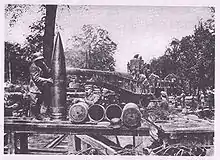 When used as a rolling mount, an extension of the carriage was fitted over the rear trucks to allow the ammunition car behind the mount to place ammunition on the shot truck which was then manually run up to the breech for loading. In an emplacement this extension was removed and ammunition hoisted up through a hatch on the floor of the mount, between the shot truck rails, from an ammunition car on the outer track and then lowered onto the shot truck. An estimated twelve men were required to ram the shell.[7] It used the German naval system of ammunition where the base charge was held in a metallic cartridge case and supplemented by another charge in a silk bag which was rammed first. The existence of a shell with 55 kilometres (60,000 yd) range must be regarded as unconfirmed, the longest engagement recorded for any of these guns was 44 kilometres (48,000 yd) during the bombardment of Dunkerque by Batterie Pommern in Flanders in 1917—8.[8]