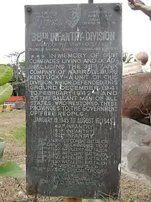 The 38th Division was inducted into federal service on 17 January 1941 as the United States prepared for entry into World War II. The Division returned to Camp Shelby to reorganize as a triangular infantry division and train for combat. The 38th Infantry Division deployed to the Pacific theater in January 1944, initially to New Guinea where the division saw limited combat after final training. In December, the division deployed into Leyte, Philippines to support clearing and security operations. On 29 January 1945, the 38th Infantry Division took part in the combat landing against the Japanese held Southern Zambales Province on the island of Luzon. Afterwards, the 38th Infantry Division took part in the operations to clear Zig Zag Pass and the Bataan peninsula, and to secure Corregidor and Manila Bay. In recognition of their contributions in clearing the Philippines, the 38th Infantry Division received the nickname "The Avengers of Bataan".