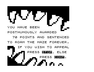 When the game ends, the player is informed about being "sentenced to roam the maze forever", and then can either "appeal" or continue playing again in the last maze. If the appeal is attempted, it is rejected with 50% probability, in which case the player is sent back to roam the previous maze again. An appeal which is accepted effectively results in the computer self-reset via BASIC's NEW statement.[5]