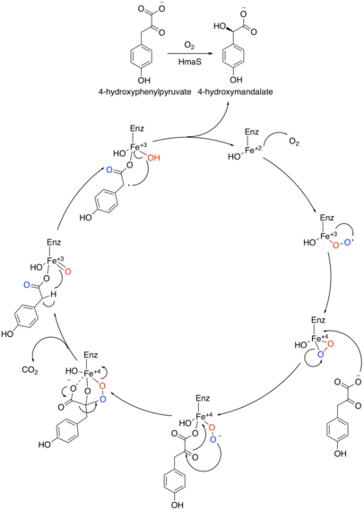 HPG is synthesized from prephenate, an intermediate in the shikimic acid pathway and also a precursor to tyrosine. Prephenate is aromatized by prephenate dehydrogenase (Pdh) using NAD+ as a cofactor to produce 4-hydroxyphenylpyruvate. 4-Hydroxyphenylpyruvate is then oxidized by 4-hydroxymandelate synthase (4HmaS) using oxygen to form 4-hydroxymandelate and hydrogen peroxide. 4HmaS is a non-heme iron-dependent dioxygenase. The reaction mechanism of this unique oxidation was proposed by Choroba et al in 2000[2]