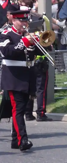 The full brass-and-reed military band provides concerts and music for regimental functions, other military events, and civilian engagements. The band includes three specialized musical sub-units: the Fanfare Trumpeters, the Brass Quintet, and the Woodwind Quintet. The band numbers between 30 and 35 members and performs at many regimental and brigade events. It is often called on to provide music for civilian and local government events[4] including the Royal Agricultural Winter Fair, Opening of Parliament at Queen's Park and The annual Queen's Plate. The band is managed by a director of music and a band sergeant major. It is a dismounted band, but dresses as dragoon guards.[5] The band performed The Garb of Old Gaul in the 2000 X-Men film.[6]