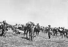 With only two squadrons remaining in Egypt, a new squadron was raised, confusingly also called 'B' Squadron. The regiment was then deployed in defence the Suez Canal, for the remainder of the year.[1] In 1916, plans were made to convert the 4th Light Horse, along with the 11th and 12th Light Horse Regiments into cameleers, but this plan was not followed through.[7] In April 1917, the regiment moved into the Sinai but were only used for rear area security.[1] The regiment was then assigned to the 4th Light Horse Brigade, and on 31 October took part in its first large battle: the Battle of Beersheba, which was part of the wider Third Battle of Gaza. During the battle, the 4th and 12th Light Horse carried out a cavalry charge on the town of Beersheba, which has since become known as the "charge of Beersheba".[1]