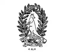 In early 1936, the regiment was amalgamated with the 19th Light Horse to form the 4th/19th Light Horse.[9] At the outbreak of the Second World War, the 4th/19th was assigned to the 3rd Cavalry Brigade, which was part of the 2nd Cavalry Division.[10] In March 1942, the 4th/19th was split again and the 4th was re-raised as a motor regiment and undertook garrison duties in Australia.[9] In 1943, it was gazetted as an AIF unit after the majority of its personnel volunteered to serve outside of Australian territory; nevertheless, it did not serve overseas and in June 1944, as the Australian Army undertook a partial demobilisation, the regiment was deemed surplus to requirements and was disbanded without having seen operational service during the war.[9]