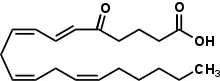 5-Oxo-eicosatetraenoic acid (i.e. 5-oxo-6E,8Z,11Z,14Z-eicosatetraenoic acid; also termed 5-oxo-ETE and 5-oxoETE) is a Nonclassic eicosanoid metabolite of arachidonic acid and the most potent naturally occurring member of the 5-HETE family of cell signaling agents. Like other cell signaling agents, 5-oxo-ETE is made by a cell and then feeds back to stimulate its parent cell (see Autocrine signaling) and/or exits this cell to stimulate nearby cells (see paracrine signaling). 5-Oxo-ETE can stimulate various cell types particularly human leukocytes but possesses its highest potency and power in stimulating the human eosinophil type of leukocyte. It is therefore suggested to be formed during and to be an important contributor to the formation and progression of eosinophil-based allergic reactions;[1][2] it is also suggested that 5-oxo-ETE contributes to the development of inflammation, cancer cell growth, and other pathological and physiological events.[1][3]