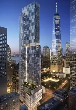5 World Trade Center (also referred to as 130 Liberty Street)[2] is a planned skyscraper at the World Trade Center in Lower Manhattan, New York City. The site is across Liberty Street, to the south of the main 16-acre (6.5 ha) World Trade Center site. In February 2021 it was announced the new 5 World Trade Center will be developed in a joint venture between Silverstein Properties and Brookfield Properties.[3] The proposed building shares its name with the original 5 World Trade Center, which was heavily damaged as a result of the collapse of the North Tower during the September 11 attacks and was later demolished.