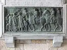 The regiment then returned to England, where it stayed until the outbreak of World War I, when it became part of the British Expeditionary Force, sailing from Dublin to France as part of the 3rd Cavalry Brigade in the 2nd Cavalry Division in August 1914 for service on the Western Front.[18] It saw action during the Battle of Mons in August 1914.[17] During the Battle of Cambrai in November 1917 George William Burdett Clare received the Victoria Cross posthumously.[19] The 5th (Royal Irish) Lancers also has the grim honour of being the regiment of the last British soldier to die in the Great War. This was Private George Edwin Ellison from Leeds, who was killed by a sniper as the regiment advanced into Mons a short time before the armistice came into effect.[20]