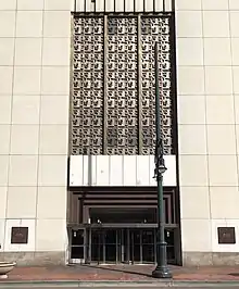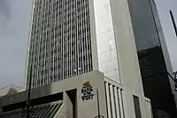At the time of its completion, 621 17th Street was known as "First National Bank Building", its primary tenant.[4] After First Interstate merged with Wells Fargo in 1996, the building's official name became its address.[4] The 434-foot (132 m) First Interstate Tower North, now known as 633 17th Street, was built adjacent to First Interstate Tower South in 1974.[5] The two buildings together form the First of Denver Plaza.[6] The building with the First of Denver logo can be seen in the opening credits of the television show Dynasty.