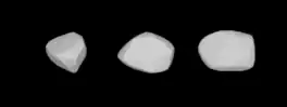 Lightcurve inversion also modeled the body's shape and poles. In 2013, modelling by an international study using photometric data from the US Naval Observatory, the Uppsala Asteroid Photometric Catalogue, the Palomar Transient Factory and the Catalina Sky Survey gave a concurring sidereal period of 5.07478±0.00002 hours and two spin axes at (218.0°, 34.0°) and (53.0°, 41.0°) in ecliptic coordinates (λ, β). The body's very elongated shape had already been indicated by the relatively high brightness variation measured during the direct photometric observations.[5][14]