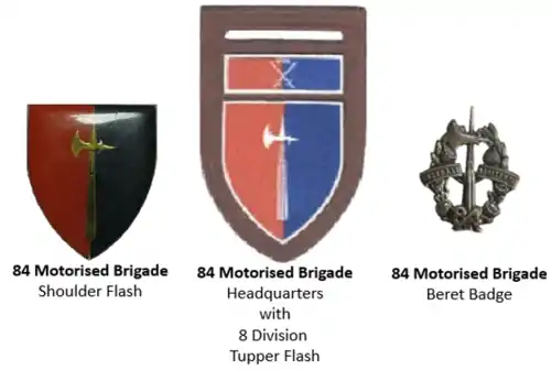 84 Motorised Brigade was a formation of 8th Armoured Division (South Africa), a combined arms force consisting of infantry, armour and artillery.