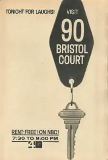 90 Bristol Court got its name from the fact that the program ran 90 minutes and the initials of Ninety Bristol Court spelled "NBC." The programming idea behind it was that viewers would be inclined to stay tuned to NBC for 90 straight minutes if they were watching three half-hour situation comedies marketed as a single block of programming and having a common theme of taking place in the same locale than they would if NBC aired a 90-minute drama or Western or a movie.[5] NBC also believed that marketing the three shows as a single programming entity would build viewer loyalty to the 90-minute block as a whole rather than merely to each of its shows separately, also tending to make viewers stay tuned for the entire 90 minutes rather than switch channels as they might if the three shows were not marketed as a single programming block.[5] Jennings Lang, the chief of television production at Universal Television, further explained to the press that the format of 90 Bristol Court allowed for "an extraordinary elasticity" because each show was a separate entity;[5] if viewers got in the habit of tuning in for 90 Bristol Court as a whole, the network could easily remove weak shows from the 90 Bristol Court lineup or reschedule hit series from it as fully stand-alone shows by having families move out of the apartment complex. NBC could also easily introduce new series into 90 Bristol Court by having new families move into the complex, all while retaining viewer interest in 90 Bristol Court as a whole and drawing viewers to the new shows as they became a part of the 90-minute programming block;[5] in fact, NBC already had a fourth show under development for 90 Bristol Court — The Trouble with Artie, possibly an alternative title for That Old Gang of Mine, starring Arthur O'Connell and Kay Medford — to replace one of the three shows that made it up.[5] Another benefit of the concept was the cost-savings of requiring only a single exterior set for all three shows, since they all took place at the same apartment complex.[6] Larry Wolters of The Chicago Tribune described the 90 Bristol Court programming concept as "a new wrinkle in comedy."[5]