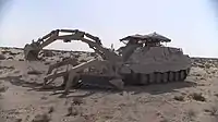 Located centrally between the crew compartment at the front of the vehicle is the excavator arm. When not in use this is traversed to the rear and locates between the crew compartment. The excavator arm broadly resembles that of a conventional backhoe loader, but with two pivot points instead of one. The standard excavator bucket has a volume of one cubic meter and, when in continuous use, can move up to 200 cubic meters of earth per hour. The arm has a maximum horizontal reach of 9 meters and a reach of 8.2 meters vertically. The bucket and other tools can be removed/attached from under armour via a quick-coupling device. A range of other tools are available and these include a gripper, a hydraulic hammer, an earth auger, or a fascine launching system.[1] On a rack above the rear engine deck two of these tools may be transported if required. The excavator arm may also be used for lifting items such as logs or fascines, and has a maximum lift capacity of 3.5-tonnes; 2.6-tonnes with the bucket attached.[1][2]