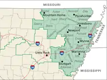 The district took in additional counties in the southeastern portion that were part of the 4th district which in turn took the entire eastern Arkansas border. It fully encompasses the counties of Arkansas, Baxter, Chicot, Clay, Cleburne, Craighead, Crittenden, Cross, Desha, Fulton, Greene, Independence, Izard, Jackson, Lawrence, Lee, Lincoln, Lonoke, Mississippi, Monroe, Phillips, Poinsett, Prairie, Randolph, Saint Francis, Searcy, Sharp, Stone, and Woodruff. The district also encompasses parts of Jefferson county.