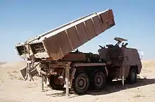 The next step is an ambitious program, the ASTROS 2020 (MK6), based on a 6x6 wheeled chassis.[8] Being a new concept, it will require an estimated investment of R$1.2 billion, of which about US$210 million will be invested solely in development. It will be integrated with the cruise missile AVMT-300 with 300-km range during the stage of testing and certification. It is said that the venture will, for example, enable the Army to integrate the Astros with defense anti-aircraft guns, paving the way for the utilization of common platforms, trucks, parts of electronic sensors and command vehicles.[9][10] The new MK6 system will use Tatra Trucks’ T815-790R39 6×6 and T815-7A0R59 4×4 trucks instead of the original Mercedes-Benz 2028A 6x6 truck. ASTROS 2020 offers several basic improvements including an improved armored cabin, modern digital communications and navigation systems, and a new tracking radar that replaces the AV-UCF’s Contraves Fieldguard system.[3] The new tracking radar used by MK6 AV-UCF was latter revealed to be the Fieldguard 3 Military Measurement System from Rheinmetall Air Defence.[11] The Astros 2020 will also be equipped with a 180 mm GPS-guided rocket called the SS-AV-40G with a range of 40 km (25 mi) and SS-150 newly developed rockets with a claimed maximum range of 150 km. Four of them are carried.[8] 36 Astros 2020 systems are to be acquired.[12]