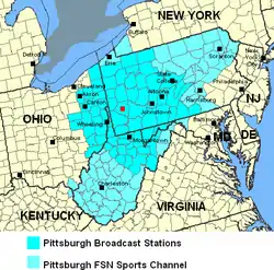 As of August 2013, AT&T SportsNet Pittsburgh is available on cable providers throughout nearly all of Pennsylvania (outside the Philadelphia market), almost all of West Virginia, western Maryland, eastern Ohio, southwestern border areas of New York and Ashland, Kentucky, reaching more than 2.4 million homes; it is also available in the Columbus, Ohio market through DirecTV Stream, though Penguins broadcasts are blacked out due to the presence of the Columbus Blue Jackets.[1] It is also available nationwide on satellite via DirecTV.