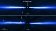 The presence of the inner hole and asymmetric structure has led a number of astronomers to search for planets orbiting AU Microscopii. By 2007, no searches had led to any detections of planets.[27][28] However, in 2020 the discovery of a Neptune-sized planet was announced.[4] Its rotation axis is well aligned with the rotation axis of the parent star, misalignment being equal to 5+16