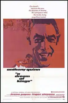 A Dream of Kings is a 1969 drama film directed by Daniel Mann and written by Ian McLellan Hunter, adapted from the novel of the same name by Harry Mark Petrakis.[2] The film stars Anthony Quinn, Irene Papas, Inger Stevens, and Sam Levene. It was also the final film for Inger Stevens, who committed suicide two months after the film's release, and the first for Radames Pera.