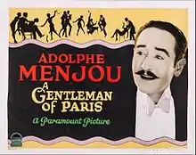 A Gentleman of Paris is a 1927 American silent comedy film loosely based on the novel and play Bellamay the Magnificent by Roy Horniman. The film was directed by Harry d'Abbadie d'Arrast and stars Adolphe Menjou, Arlette Marchal, Nicholas Soussanin, Lawrence Grant, and William B. Davidson. The feature has been preserved and was released on DVD in 2010. The movie was also the basis for the 1928 film A Certain Young Man.[1][2]