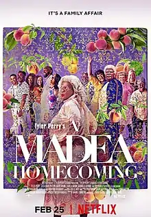 A Madea Homecoming is a 2022 American comedy film produced, written, and directed by Tyler Perry and his second film to be released by Netflix. Besides Perry, the film stars Cassi Davis-Patton, David Mann, Tamela Mann, Brandon Black, Gabrielle Dennis, and Brendan O'Carroll. It is the twelfth film in the Madea cinematic universe which tells the story of Madea partaking in her great-grandson's college graduation party as hidden secrets emerge. It was released on February 25, 2022. It is adapted from Perry's stage play Madea's Farewell Play, the first Madea film to be adapted from a stage play since A Madea Christmas. The film is also a crossover between the Madea franchise and the Irish sitcom Mrs. Brown's Boys.