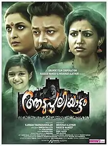 Aadupuliyattam (transl. Goat and Tiger game) is a 2016 Indian Malayalam-language horror film directed by Kannan Thamarakkulam and written by Dinesh Palleth, starring Jayaram, Om Puri, Ramya Krishnan, Sheelu Abraham, Akshara Kishor, Saju Navodaya, Ramesh Pisharody and Sampath Raj in lead roles.[1][2] The major filming locations are Palani and Thodupuzha. Film released on 20 May 2016. The horror thriller film is dubbed in Tamil as Shenbaga Kottai and Telugu as Mathangi and Hindi as Mera Badla 2.[3] The film was a commercial success at the box office. The film is the Malayalam debut of Bollywood actor Om Puri.