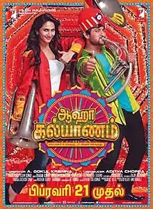 Aaha Kalyanam (transl. Wow Marriage) is a 2014 Indian Telugu-language romantic comedy film directed by debutant A. Gokul Krishna and produced by Aditya Chopra's Yash Raj Films.[2] A remake of Maneesh Sharma's 2010 Hindi film, Band Baaja Baaraat, the film features Nani and Vaani Kapoor in the lead roles.[3] Although it was planned for bilingual release, it was shot completely in Tamil, and a dubbed Telugu version was released simultaneously along with the Tamil version.[4] The film was released worldwide on 21 February 2014.