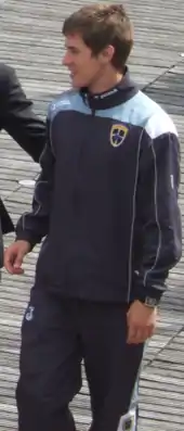 On 31 May 2016, Ramsey was included in Chris Coleman's 23-man Wales squad for Euro 2016.[129] On 11 June, in Wales' opening match of the tournament, he set-up Robson-Kanu's match-winning goal in a 2–1 win over Slovakia;[130] this was Wales's first win in a major international football tournament in 58 years.[131] On 20 June, in his team's final group match, he scored the opening goal of a 3–0 win over Russia, which saw Wales top their group; he also set-up the final goal of the match, which was scored by Gareth Bale.[132][133][134] In the round of 16 match against Northern Ireland on 25 June, Ramsey once again contributed to a Welsh victory in the 75th minute of play; he played a pass to Gareth Bale, who then delivered a cross into the penalty area; defender Gareth McAuley deflected the ball into his own net, and Wales won the match 1–0. Ramsey was booked in injury-time for kicking the ball away after conceding a foul.[134][135][136] In the quarter-final against Belgium on 1 July, Ramsey set up two goals in a 3–1 win which ultimately saw his nation advance to the semi-finals; however, he was booked for the second time in the tournament during the match, which ruled him out of the semi-final.[137] Wales were eliminated from the tournament in the following match by eventual champions Portugal on 6 July.[138] Ramsey finished the tournament as the joint-highest assist provider, with four assists, alongside Eden Hazard,[139] and was named to the team of the tournament for his performances.[140]