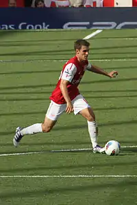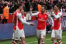On 19 October, he scored a solo goal against Norwich City, which was his ninth goal for Arsenal in the season, before assisting the fourth Arsenal goal in a 4–1 win.[69] His good form continued into November as he scored a spectacular long range shot from outside of the box in a 2–0 win against Liverpool on 2 November to put Arsenal five points clear at the top of the Premier League table with ten games played.[70] He also scored a crucial second-half header four days later against Borussia Dortmund in a 1–0 away victory in the Champions League group stages, bringing his goal tally to 13 in 21 appearances for club and country. On 30 November, he scored two goals against his former club Cardiff City, and refused to celebrate out of respect.[71] He received applause from Cardiff fans, with some even joining Arsenal fans in singing his name late on.[71] On 26 December, he suffered a thigh strain in Arsenal's away fixture against West Ham United,[72] eventually missing over three months of the season.[73]
