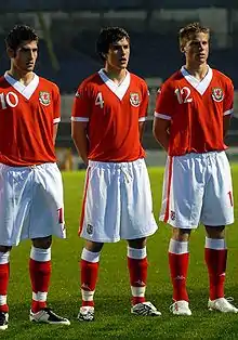Ramsey made his debut for the Wales national football team on 19 November 2008, aged 17, playing 88 minutes of a 1–0 away win in Denmark.[116][117] On 14 October 2009, he scored his first senior goal in the 2010 World Cup qualifier away at Liechtenstein from a free kick awarded for a trip on Gareth Bale.[118] As the World Cup qualification campaign came to an end, he and 11 other senior internationals were recalled to Flynn's preliminary U21 squad on 30 October for a qualifier but later withdrew.[119] On 6 November, Toshack also called him up for 14 November friendly against Scotland.[120] Wales won 3–0 and Ramsey was involved in all of them – assisting David Edwards' opener, setting up Joe Ledley to assist the second and then scoring a solo effort.[121] Ramsey was awarded the FAW's Young Player of the Year award that same month.[122][123]