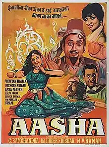 Aasha (transl. Hope) is a 1957 Indian Hindi-language romantic comedy film directed by M. V. Raman. It stars Kishore Kumar, Vyjayanthimala in lead roles. The film was a critical and commercial success.[1] This film was partly coloured by both Gevacolor and Technicolor. The film was remade in Tamil as Athisaya Penn. Asha Parekh appears in the song 'Chal Chal Re Kanhai' and one scene after it with Vyjayanthimala.