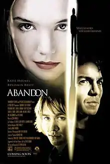 Abandon is a 2002 American psychological thriller drama film written and directed by Stephen Gaghan in his directorial debut. It stars Katie Holmes as a college student whose boyfriend (Charlie Hunnam) disappeared two years previously. Despite being set at an American university, much of the movie was filmed in Canada at McGill University's McConnell Hall. It is based on the book Adams Fall by Sean Desmond. The book was re-titled[2] Abandon for the movie tie-in paperback printing. The film co-stars Zooey Deschanel and Gabrielle Union, with Benjamin Bratt playing the detective investigating the boyfriend's disappearance. It received generally negative reviews.