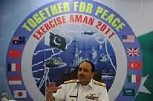 ![]() V-Adm. Abbas Raza addressing a press conference during multinational naval exercise AMAN 2011 | |