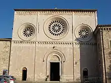 The Romanesque façade was completed in 1268.[2] It is rectangular, with three entries, each surmounted in the second tier by three rose windows. The two sections are separated by a cornice of hanging arches. The central portal is flanked by two lions. The rosettes contain hints of Gothic styling.[2]