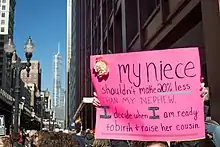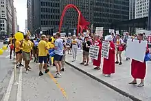 Women from the state participated in marches supporting abortion rights as part of a #StoptheBans movement in May 2019.[52] Many women in Chicago wore red, referencing women in Margaret Atwood's The Handmaid's Tale.[53]