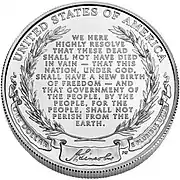 The obverse of the Abraham Lincoln Bicentennial commemorative dollar, designed by Justin Kunz, depicts an image of President Lincoln, which was inspired by Daniel Chester French's famous sculpture of the President that sits inside the Lincoln Memorial in Washington. The reverse, designed by Phebe Hemphill, features the last 43 words of the Gettysburg Address.[4]