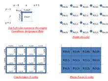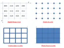 This decomposition together with a coordinate assignment rule to unambiguously assign coordinates from the image pixels to the dimensional constituents permit certain image analysis operations to be carried out on the image with elegant algorithms such as crack boundary tracing, digital straight segment subdivision, etc. One such rule maps the points, cracks, and faces to the top left coordinate of the pixel. These dimensional constituents require no explicit translation into their own data structures but may be implicitly understood and related to the 2D array which is the usual data structure representation of a digital image. This coordinate assignment rule and the renderings of each cell incident to this image is depicted in the image at right.