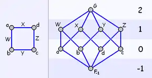 Smaller posets, and polytopes in particular, are often best visualised in a Hasse diagram, as shown. By convention, faces of equal rank are placed on the same vertical level. Each "line" between faces, say F, G, indicates an ordering relation < such that F < G where F is below G in the diagram.