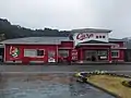 The station building in 2018, in the colour scheme of the Hiroshima Toyo Carp baseball team, paid with a crowd funding project by fans.[5]