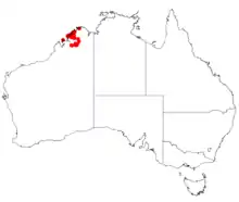 It is native to an area in the Kimberley region of Western Australia.[1] The shrub has a scattered distribution with separate populations found through the West Kimberley particularly along the Bonaparte Archipelago, the Broome and Napiere Bay areas and inland as far as Phillips Range, Kimberley Downs Station and Beverley Springs Station where it is found on areas of sandstone growing in sandy soils as a part of open woodland communities.[2]