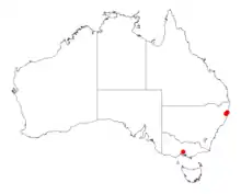 In is endemic to a small area in the north eastern corner of New South Wales within the Brierfield- Newry State Forest region where it is often situated in steep narrow gullies growing in quartzite based soils as a part of tall open forest communities or in rainforest communities as a component of the understory.[2] It is known from two locations within the Jaaningga Nature Reserve where 1,200 individuals are known and two much smaller populations of around 30 individuals near the Gladstone State Forest over a total area of approximately 25 km2 (9.7 sq mi).[3]