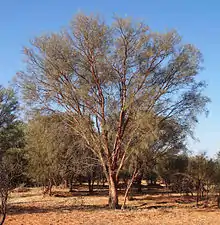 Acacia cyperophylla, commonly known as creekline miniritchie or red mulga, is a tree in the family Fabaceae. The species' range extends across arid and semi-arid regions of Central Australia, from Carnarvon in Western Australia to western Queensland and eastern New South Wales.[3] It is commonly found growing in areas of slightly higher soil moisture such as in drainage lines and on the banks of rivers and creeks.[1]