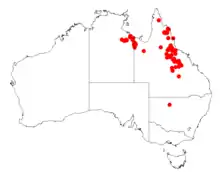 It is endemic to an area in the western part of the top end of the Northern Territory and north-western parts of Queensland. It is also found along the Great Dividing Range in Queensland from around Torrens Creek in the north down to about 150 km (93 mi) north of Clermont where it is often situated on slopes and ridges growing in sandt, clayey or rocky soils around and over sandstone or granite as a part of Acacia or Eucalyptus woodland communities.[1]