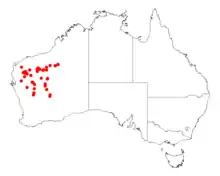 It is endemic to the Mid West and Pilbara regions of Western Australia.[2] It has a scattered distribution from around Mount Magnet in the south west to around Leonora in the south east to the Pilbara region and around the Rudall River catchment and the Little Sandy Desert with smaller populations close to the border with South Australia.[1]