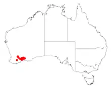 It is native to an area in the Wheatbelt and Goldfields-Esperance regions of Western Australia where it is commonly situated on flats and undulating plains growing in sandy, clay or loamy soils.[1] It has a scattered distribution from around Nyabing in the south west to around Peak Charles National Park in the north east where it is usually a part of low Eucalyptus woodlands or open mallee shrubland communities.[2]