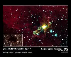 At the next stage, the envelope completely disappears, having been gathered up by the disk, and the protostar becomes a classical T Tauri star.[13] The latter have accretion disks and continue to accrete hot gas, which manifests itself by strong emission lines in their spectrum. The former do not possess accretion disks. Classical T Tauri stars evolve into weakly lined T Tauri stars.[14] This happens after about 1 million years.[8] The mass of the disk around a classical T Tauri star is about 1–3% of the stellar mass, and it is accreted at a rate of 10−7 to 10−9 M☉ per year.[15] A pair of bipolar jets is usually present as well. The accretion explains all peculiar properties of classical T Tauri stars: strong flux in the emission lines (up to 100% of the intrinsic luminosity of the star), magnetic activity, photometric variability and jets.[16] The emission lines actually form as the accreted gas hits the "surface" of the star, which happens around its magnetic poles.[16] The jets are byproducts of accretion: they carry away excessive angular momentum. The classical T Tauri stage lasts about 10 million years.[8] There are only a few examples, so-called Peter Pan Disk where the accretion lasts for more than 20 million years.[17] The disk eventually disappears due to accretion onto the central star, planet formation, ejection by jets, and photoevaporation by ultraviolet radiation from the central star and nearby stars.[18] As a result, the young star becomes a weakly lined T Tauri star, which, over hundreds of millions of years, evolves into an ordinary Sun-like star, dependent on its initial mass.