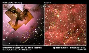 As the infall of material from the disk continues, the envelope eventually becomes thin and transparent and the young stellar object (YSO) becomes observable, initially in far-infrared light and later in the visible.[11] Around this time the protostar begins to fuse deuterium. If the protostar is sufficiently massive (above 80 MJ), hydrogen fusion follows. Otherwise, if its mass is too low, the object becomes a brown dwarf.[12] This birth of a new star occurs approximately 100,000 years after the collapse begins.[8] Objects at this stage are known as Class I protostars, which are also called young T Tauri stars, evolved protostars, or young stellar objects. By this time, the forming star has already accreted much of its mass; the total mass of the disk and remaining envelope does not exceed 10–20% of the mass of the central YSO.[11]